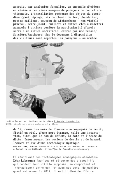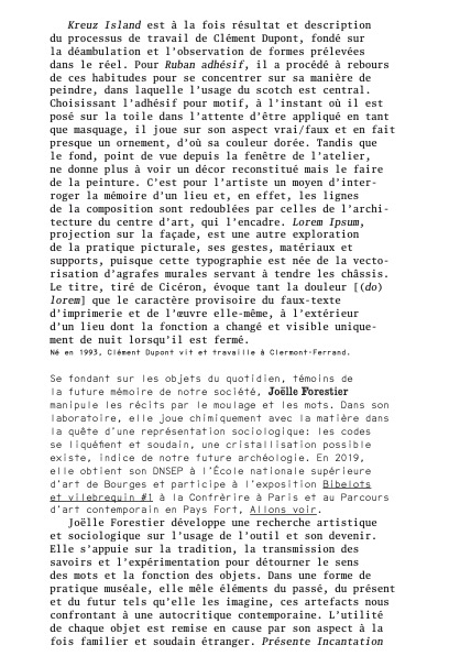 Extrait du flyer d’Exposition Éclats #1 : Constellation provisoire, du 20.02.2020 au 26.04.2020, commissariat : Aurélie Barnier à l’Usine du May, dans le cadre du Creux de l’Enfer, Thiers.