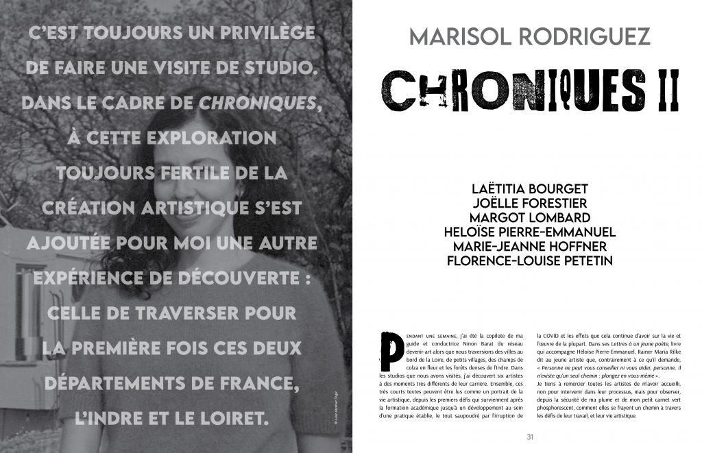 Chroniques 2024 · Marisol Rodriguez, Lauréate du deuxième appel à candidature pour le programme Chroniques, a été invitée dans les territoires de l’Indre et du Loiret par devenir·art, en partenariat avec l’AICA-France et Revue Laura. Page 28-29-31 de la Revue Laura numéro 35.